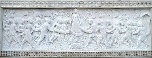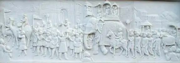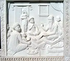An earthquake on 26 January 2001 shattered most parts of the city of Bhuj, including the original Shri Swaminarayan Mandir, Bhuj built by Swaminarayan in 1824. To replace this, the new temple is built of only marble and gold. The throne for the idol of Swaminarayan, the temple domes and doors are make of gold while the pillars and ceilings are made of marble.[1] The original central deity images of Nar Narayan and Swaminarayan in the form of Hari Krishna were moved from the old temple to the new one along with those of Radha Krishna, Swaminarayan in the form of Ghanshyam and Sukh Shaiya and others.[3]