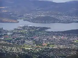 ![]() New Town viewed from Lost World to the west. New Town Bay is on the left and Cornelian Bay is on the right behind the suburb. | |||||||||||||||