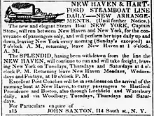 On April 4, 1836,[7] New York commenced a daily passenger-and-mail service from New York to New Haven, replacing the company's steamboat Splendid, which went into reserve. New York initially ran as a passenger-only service, six days a week, while her stablemate, the steamer New Haven, operated a freight service on the same route three days a week. Not long after New York's introduction however, the Post Office insisted upon a seven-day-a-week service, which was duly implemented in spite of company protests. At this time, the passenger fare from New York to New Haven was $2 (equivalent to $49 in 2021). New York and New Haven were to maintain this busy and well patronized service for the next three years.[4]