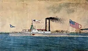 Two days earlier, on April 23, the Great Western—the first steamship expressly designed to make regular transatlantic crossings—had arrived in New York, completing her historic maiden voyage.[lower-alpha 4] Great Western's scheduled departure on May 7 attracted much public interest, and numerous steamboat owners arranged excursions for the upcoming event,[11] including New York's, who advertised a three-hour excursion at fifty cents a head, with onboard entertainment including a brass band.[12] Other steamboats charged between a dollar and 25 cents for similar services. On the day in question, an estimated 50,000 people turned out to farewell the British ship, with a large fleet of steamboats and other watercraft, including New York, escorting the vessel out of the harbor.[11]