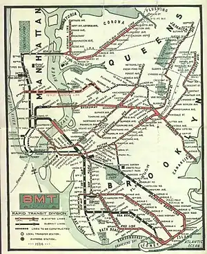 Starting in 1899, the Brooklyn Rapid Transit Company (BRT; 1896–1923) and Brooklyn–Manhattan Transit Corporation (BMT; 1923–1940) operated rapid transit lines in New York City — at first only elevated railways and later also subways.