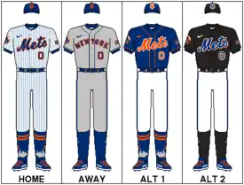 The blue alternate uniform, introduced in 2012, features the "Mets" script and block lettering and numbers in orange with white outline, and orange piping. The blue alternates are worn with a secondary blue cap featuring the "NY" logo in orange trimmed in white.