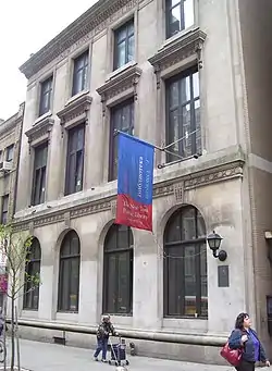 An act of the New York State Legislature incorporated the Lenox Library in 1870.[15][16] The library was built on Fifth Avenue, between 70th and 71st Streets, in 1877. Bibliophile and philanthropist James Lenox donated a vast collection of his Americana, art works, manuscripts, and rare books,[17] including the first Gutenberg Bible in the New World.[13] At its inception, the library charged admission and did not permit physical access to any literary items.[18]