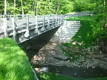 Milone & MacBroom explained that the former bridge, due to both the 45-degree angle at which it crossed the West Kill and its height over the stream, constricted the stream flow during 100-year floods. The firm indicated it was consulting with the state Department of Transportation on the design for a new bridge. It called for the bridge's lower chord to be raised a foot; the additional freeboard would allow more water to flow downstream during floods, thus lowering their levels upstream, away from homes and businesses along the road.[10]: 36 In 2017, the bridge was replaced at a cost of $4.1 million, part of a larger ongoing project to replace bridges all over the state; a temporary bridge over the West Kill allowed traffic to continue using the route during construction.[11]