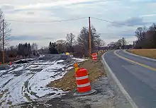 Prior to the project, Drury Lane had been maintained by Orange County as County Route 54. In February 2007, it was announced that the highway would become state-maintained and be designated as NY 747 once the project was completed.[2] On July 30, 2007, Route 747 was de facto open. Drury Lane was closed off north of the aqueduct and traffic was routed onto the new roadway between both termini, and on the new overpass. Road crews began removing the pavement from the former roadbed and dismantling the old overpass.