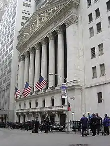 The main New York Stock Exchange Building, built in 1903, is at 18 Broad Street, between the corners of Wall Street and Exchange Place, and was designed in the Beaux Arts style by George B. Post.[37] The adjacent structure at 11 Wall Street, completed in 1922, was designed in a similar style by Trowbridge & Livingston. The buildings were both designated a National Historic Landmark in 1978.[38][39][40] 18 Broad Street is also a New York City designated landmark.[41]