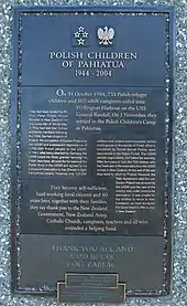 New Zealand declared war on Germany on 3 September 1939, the third day of the German invasion of Poland, which started World War II,[3] and was one of the first countries to do so. New Zealand soldiers fought alongside their Polish counterparts during the Battle of Britain and the Battle of Monte Cassino in Italy. New Zealand prisoners of war were among Allied POWs held in German POW camps operated in German-occupied Poland. In 1944, over 730 Polish children (mainly orphans) and 105 adults were settled in New Zealand.[4] The refugees had survived deportation from Soviet-occupied eastern Poland to the Soviet Union, including Siberia, and escaped to New Zealand via Persia (today known as Iran) and settled in the town of Pahiatua on the North Island of New Zealand.[5] New Zealand was the most distant place from Poland in which Polish refugees ended up during World War II.[4] The refugee camp for Polish children in Pahiatua existed until 1949, and it had a Polish elementary school (until 1949) and a secondary school (until 1946).[4] At the end of the war, more than 200 former soldiers and 700 displaced people from Poland were resettled to New Zealand.[6]