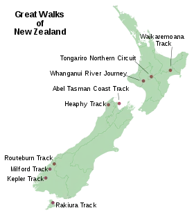 The New Zealand Great Walks are a set of popular tramping tracks developed and maintained by the Department of Conservation.[1] They are New Zealand's premier tracks, through areas of some of the best scenery in the country, ranging from coastlines with beaches to dense rain forests and alpine terrain. The tracks are maintained to a high standard, making it easier for visitors to explore some of the most scenic parts of New Zealand's backcountry.