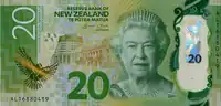 The New Zealand twenty-dollar note is a New Zealand banknote. It is issued by the Reserve Bank of New Zealand and since 1999 has been a polymer banknote. It was first issued on 10 July 1967 when New Zealand decimalised its currency, changing from the New Zealand pound to the New Zealand dollar. It has an image of Queen Elizabeth II on the front.[1][2]
