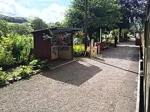The station is an un-staffed halt, with a small waiting shelter in which historical photographs of the halt are displayed, illustrating its condition both before and after reopening. There is seating inside the shelter as well as on the platform.[2]