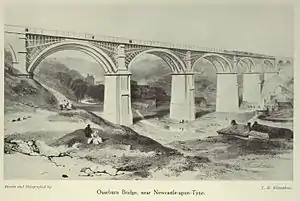 ![]() Ouseburn Bridge, near Newcastle, built by the Newcastle and North Shields Railway in the 1830s using laminated timber arches on masonry piers, similar to the Wiebeking system used in Paris | |