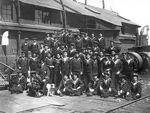The Newfoundland Royal Naval Reserve was a military reserve force founded in 1900 in what was then the Newfoundland Colony, a part of the British Empire.[1] From 1900 to 1902, approximately 50 members of the reserve trained each winter with the North American and West Indies squadron of the Royal Navy until a steam and sail powered training ship, HMS Calypso, was provided by the United Kingdom in 1902 for local drills before at-sea training with the NA and WI squadron.[2] The reserve had 375 members by late 1903 and then between five and six hundred reservists until the start of World War I, growing to over 1000 in 1915. 1,964 Newfoundlanders served with the Naval Reserve in World War I, suffering 192 fatalities.[3] The Reserve disbanded in 1920-1921. Calypso, having been renamed HMS Briton, was sold as a storage hulk and was burned for salvage near Lewisporte, Newfoundland and Labrador.