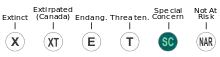 The Newfoundland marten is considered to be endangered and is protected in Canada under the Species at Risk Act (SARA), the Canada National Parks Act, and the Newfoundland and Labrador Endangered Species Act. The animal was first designated as Threatened in 1986, and was redesignated as Endangered in 1996 and 2000, with an estimated population of 300. COSEWIC re-evaluated the species in April 2007, and changed the designation to Threatened.[17]