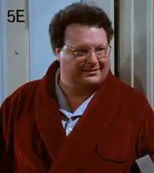 Among the actors who auditioned for the part were Armin Shimerman, Dan Schneider and Wayne Knight.[4][12] Knight remarked that he was very excited to audition, as he was already a fan of the show.[5] David immediately thought Knight was "terrific" for the part,[5] and was also amused by his hefty appearance as opposed to Kramer's slim figure.[11] Though Seinfeld felt introducing a friend of Kramer might ruin the character's mystique, Knight's performance convinced him otherwise.[5] The part was initially a one-time guest-appearance, but Seinfeld and David were impressed with Knight and felt Newman was a character they could further exploit; as Michael Richards later explained "our show was driven by characters and there was no way they were going to let Wayne Knight go."[5] Newman would remain a recurring character until the series' finale in 1998. To establish better continuity, Knight re-recorded Newman's lines in "The Revenge" for the syndicated version of the episode.[7][8] Both versions of the dialogue were included on the Seinfeld: Volume 1 DVD boxset.[8][13]