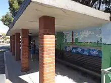 The Newmarket air raid shelter is a rectangular concrete structure comprising a heavy floor slab, rear and side nib blast walls, a flat roof and five brick piers. The original floor slab is covered with concrete topping and an outer edge of pavers, and the rear concrete wall has a mural painted to the interior while the exterior of the rear wall remains unpainted. The roof fascias are painted yellow. The original air-raid shelter timber seat is painted green and is located against the rear wall. There is evidence of the entrances to Enoggera Road on the soffit. Wiring for lighting has been introduced.[1]