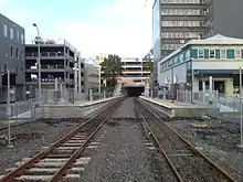 Newmarket station was rebuilt for NZ$35 million between January 2008 and January 2010 as part of ONTRACK's Project DART.[1][15] It was necessary to close the station for the rebuild and two temporary stations were built: Newmarket South, approximately 200m south on the Southern Line, and Newmarket West (also called Kingdon Street) on the Western Line.[16] Both stations were demolished later. As well as modernising the facilities and appearance, the redevelopment improved connections between the station and the surrounding commercial and residential areas. The station now has a concourse level above the platforms, and entrances from a new square off Broadway, a 65m long covered bridge (capable of carrying emergency vehicles) off Remuera Road, and a pedestrian bridge from Joseph Banks Terrace, from the Remuera side.[1]