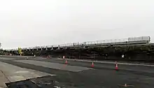 By April 2012, the station was 49% complete; the platforms were in place but no ramps or canopies had been constructed.[8] By September, canopies were in place and the ramps were under construction. After substantial work during the summer, the station was 70% complete by mid-September.[14] Completion reached 85% by April 2013. Newmarket was substantially completed for its opening on July 1, 2013, with all construction to be finished by August 2013.[15][2] Ribbon-cutting ceremonies were held at Newmarket, Four Corners/Geneva, and Talbot Avenue on July 17, 2013.[16]