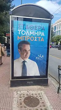 New Democracy also used the motto Greek: Η Ελλάδα δε γυρίζει πίσω, lit. 'Greece is not going back', a prominent motto of the party under Konstantinos Mitsotakis' leadership during the 1993 Greek legislative election.[20][21][22]Additionally, ΚΚΕ supplemented its main slogan with: Greek: #ΤΩΡΑ_ΚΚΕ, lit. '#NOW_ΚΚΕ',[23] while PASOK-KINAL also used a secondary motto in speeches and TV spots: Greek: Απόφαση Αλλαγής, lit. 'Decision for Change'[24][25]