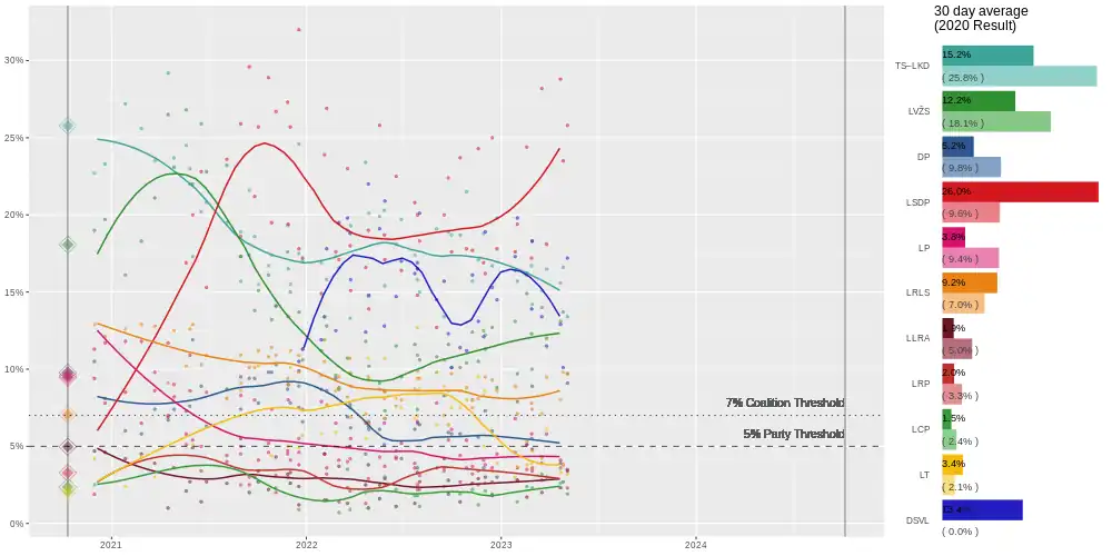 | Baltijos tyrimai | 15–28 February 2023[lower-alpha 1] | 1,003 | 14.2 | 10.0 | 8.9 | 18.3 | 3.4 | 7.4 | 4.8 | 3.6 | 2.3 | 4.7 | 18.3 | Tie |