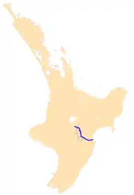 The Ngaruroro River is located in the eastern North Island of New Zealand. It runs for a total of 164 kilometres southeast from the Kaweka Range, Kaimanawa Range and Ruahine Range and then east before emptying into Hawke Bay roughly halfway between the cities of Napier and Hastings, near the town of Clive (drainage area 2,000 square kilometres (770 sq mi) [1] above Tutaekuri River confluence). About 40% of the catchment is pasture, and 55% native forest.[2] The meaning of Ngaruroro is obscure.[3]