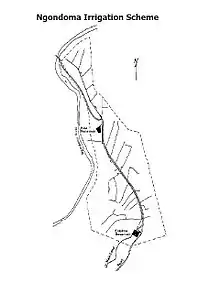 Ngongoma Irrigation Scheme has a gravity fed surface irrigation system.[1] A canal conveys water from the dam into a reservoir which is situated just at the edge of the irrigation scheme. From the reservoir another canal conveys water to various portions of the irrigation and from a lateral to fields farmers fetch water using siphons. Another night storage has been built about 1500m to the northend of the scheme to service plots further afield.