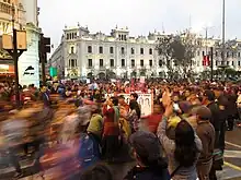 In Peru, over 30% of women report suffering physical violence at the hands of a spouse in their lifetime.[29] Further, in a 2006 World Health Organization survey, they found that Peru had the highest rates of violence in the region with 61% reporting violence experiencing violence at the hands of an intimate partner.[30] The NiUnaMenos (Peru) movement was sparked in July 2016 when Adriano Pozo Arias, a known abuser, was released from jail. A video captures him attacking his girlfriend, Cindy Arlette Contreras Bautista. He was convicted and sent to jail but only served a one-year sentence. Another case that impulsed Peruvians into action was when Ronny Garcia beat Lady Guillen.[31] The resulting protest on August 13, 2016 has been recognized as the largest protest in Peruvian history with hundreds of thousands of people in attendance in Lima.[32] People were mobilized and the march's logistics were planned over Facebook as tensions and frustrations about high levels of feminicide and the lack of a strong state response to this issue increased.[31] There have been subsequent Ni Una Menos marches in Peru on 2017[33] and 2018.[34]