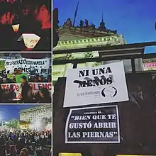 Ni una menos (Spanish: [ni ˈuna ˈmenos]; Spanish for "Not one [woman] less") is a Latin American fourth-wave[1][2] grassroots[3] feminist movement, which started in Argentina and has spread across several Latin American countries, that campaigns against gender-based violence. This mass mobilization comes as a response to various systemic issues that proliferate violence against women. In its official website, Ni una menos defines itself as a "collective scream against machista violence."[4] The campaign was started by a collective of Argentine female artists, journalists and academics, and has grown into "a continental alliance of feminist forces".[5] Social media was an essential factor in the propagation of the Ni Una Menos movement to other countries and regions. The movement regularly holds protests against femicides, but has also touched on topics such as gender roles, sexual harassment, gender pay gap, sexual objectification, legality of abortion, sex workers' rights and transgender rights.