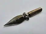 According to Mathur et al., "the modern fountain pen nib may be traced back to the original gold nib which had a tiny fragment of ruby attached to form the wear-point."[18] Following the discovery of the platinum group of metals which include ruthenium, osmium and iridium, "a small quantity of iridium was isolated and used on the iridium-tipped gold dip pen nibs of the 1830s".[18] Today, nibs are usually made of stainless steel or gold alloys, with the most popular gold content being 14 carat (58⅓%) and 18 carat (75%).[19] Titanium is a less common metal used for making nibs. Gold is considered the optimum metal for its flexibility and its resistance to corrosion, although gold's corrosion resistance is less of an issue than in the past because of better stainless steel alloys and less corrosive inks.[19]