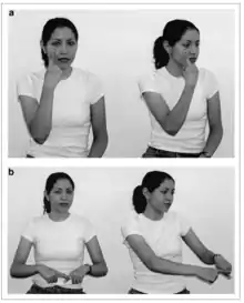 Spatial modulations are the building blocks of all sign languages studied to date. A neutrally placed sign is in front of the chest; however, a sign can be modulated, or directionally altered, to convey many grammatical changes.