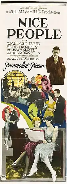 Nice People is a lost[1] 1922 American silent drama film directed by William C. deMille and starring Wallace Reid and Bebe Daniels. The movie is based on the 1921 Broadway play of the same name by Rachel Crothers that had starred Tallulah Bankhead, Francine Larrimore, and Katharine Cornell.[2] Vincent Coleman played Reid's part of the Captain.[3][4][5]