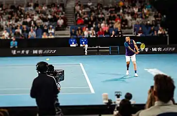 Kyrgios attended Radford College until Year 8 and completed his Year 12 certificate in 2012 at Daramalan College in Canberra.[19] He also played basketball in his early teens before deciding to focus solely on tennis when he was 14 years old.[20] Two years later, he received a full scholarship at the Australian Institute of Sport, where he was able to further develop his tennis. In 2013, Kyrgios relocated his training base from Canberra to Melbourne Park in an attempt to further his career with better facilities and hitting partners.[21] A year later, Tennis ACT announced a $27 million redevelopment of the Lyneham Tennis Centre in Canberra to lure Kyrgios back home and host Davis Cup and Fed Cup ties.[22] Kyrgios confirmed in January 2015 that he would return home and base himself in Canberra. He also donated $10,000 towards the Lyneham Tennis Centre redevelopment.[23][24]