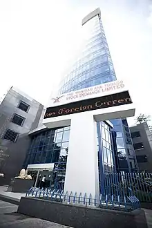Nicholas Tower, situated on Independence Square, Port of Spain, Trinidad and Tobago is the fifth tallest building in Trinidad and Tobago.[1] It has an elliptical floor plate and stands 21[2] floors tall and 88 Meters high. Construction was completed in 2003 and each floor, 8,000 square feet (700 m2) of space, was rented out at a cost of $96,000 a month[3] (as of 2005). It is a blue glass tower.