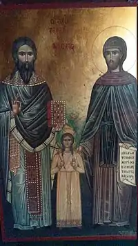 Raphael, Nicholas, and Irene of Lesbos (Greek: Ραφαήλ, Νικόλαος και Ειρήνη) are venerated as saints and neomartyrs in the Eastern Orthodox Church.[1][2][3] According to a 20th-century legend, they lived on the island of Lesbos in the 15th century and were killed by Turkish raiders in April 1463. Raphael is said to have been the abbot of a monastery of Karyes, near the village of Thermi, Nicholas a deacon in the same monastery, and Irene the 12-year-old daughter of the local mayor.