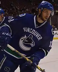 On June 27, 2014, after a breakout season in 2013–14, Bonino was traded to the Vancouver Canucks with defenseman Luca Sbisa and a first- and third-round pick in 2014 in exchange for Ryan Kesler and a third-round pick in 2015.[78] While playing with the Canucks during the pre-season, Bonino tallied two goals and two assists for four points through five games.[79] He continued to show off his offensive abilities during the regular season and quickly became one of the Canucks top point scorer. By the seventh game of the season, Bonino had tallied two goals and two assists for four points.[80] While maintaining his scoring prowess, Bonino centred the Canucks second line between Alex Burrows and Chris Higgins.[81] By the end of October, Bonino had accumulated four goals and five assists through the first 12 games of the season.[82] He continued to build momentum throughout November and December and was consistently ranked among the Canucks top scorers.[83][84] Bonino finished the first quarter of the season with eight goals and 13 assists for 21 points through 34 games.[84]