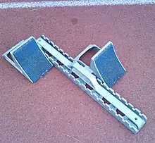 Starting blocks are the device sprinters use to hold their feet at the start of a race so they do not slip as they push out at the sound of the gun.