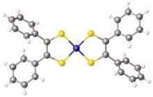 Nickel bis(stilbenedithiolate) or bis(dithiobenzil)nickel is a coordination complex with the formula Ni(S2C2Ph2)2 (where Ph = phenyl). It exists as a black solid that gives green solutions in toluene due to a strong absorption at 855 nm. The complex is a prototype of a large family of bis(dithiolene) complexes or the formula Ni(S2C2R2)2 (R = H, alkyl, aryl). These complexes have attracted much attention as dyes. They are of academic interest because the dithiolenes are noninnocent ligands.[2] The lengths of the C-S and C-C bonds in the backbone, respectively 1.71 and 1.39 Å, are intermediate between double and single bonds.[3]
