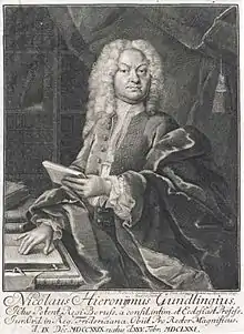 Nicolaus Hieronymus Gundling (February 25, 1671 – December 9, 1729), was a German jurist and eclectic philosopher. He was born in Kirchensittenbach, and died in Magdeburg. He was the brother of Jacob Paul von Gundling, Court Historiographer to King Frederick I of Prussia, who became a figure of ridicule in the "Tobacco Cabinet" (Tabakskollegium) of Frederick William I.