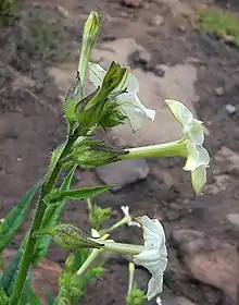 Nicotiana quadrivalvis is a species of wild tobacco known as Indian tobacco. It is endemic to the western United States, where it grows in many types of habitat. It is a bushy, sprawling annual herb growing up to two meters in maximum height. The lower leaf blades are up to 15 centimetres (6 in) long and are borne on short petioles, the upper smaller and sessile on the stem. The inflorescence is an array of several white, greenish, or purple-tinged flowers with tubular throats up to 5 centimeters long. The base of each is enclosed in a ridged calyx of sepals. The flower face may be 5 centimetres (2 in) wide. The fruit is a capsule up to 2 centimetres (3โ„4 in) in length.