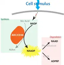 Like any second messenger system, the signal must be terminated and there must be routes for NAADP removal but again, little is known with any degree of certainty. A 2'-3'-phosphatase stimulated by Ca2+ has been proposed in brain[12] and, possibly in pancreatic acinar cells, that catabolises NAADP to inactive NAAD. CD38 has also been found to breakdown NAADP (to ADPRP — see inset).[10] NAADP may also be reduced to NAADPH.[13]