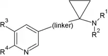 Combination of structural elements of ACh and nicotine as well as reducing the conformational flexibility by using a cyclopropane ring has led to the discovery of potent and selective α4β2 nAChR ligands. The modulation of three structural elements, the linker, substitution on the amino group and the pyridine ring can be used to determine the influence on potency and selectivity of the ligands. Factors that decrease the binding are steric hindrance on the amino group and linkers that are saturated/unsaturated carbon chains. Short-chained ether linkers are preferred. Beneficial effects on the binding is seen with substitution on the pyridine ring both mono- and disubstitution with halogens among other groups. Substitution on the amino group with three different amides increased the binding affinity where methylamide had the highest binding. Lower binding in the other substituted amides was explained by steric hindrance or lack of a methyl group resulting in loss of hydrophobic interaction. Stereochemistry of pyridine nitrogen and/or the pyridine ring and its stereoelectronic effects has a subtle beneficial effect on the binding to the α4β2 nAChR. Thus it was shown that a pyridyl ether ligand with bromo substitution on the pyridine and metylatedamide on the amino group had the highest potency.[22]