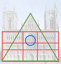 The rectangular baseline also provides the baseline of an equilateral triangle with a vertex in the west gable front, which was completed in 1963. The rose window forms a circle in the triangle. A circle in an equilateral triangle is often regarded as the symbol for "God's eye."