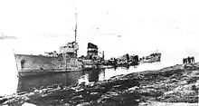 Shortly after shelling Roda, Æger observed German aircraft, sightings which revealed the identity of the invaders. Æger opened fire at the aircraft with her anti-aircraft armament. The first wave of German aircraft avoided Æger, but soon after 8–10 German Junkers Ju 88 bombers from the Luftwaffe's Kampfgeschwader 4, thought by Bruun to have been called in by Roda's captain, attacked Æger with machine-gun fire and bombs.[41][42] The Ju 88s had been attacking Sola Airport, before turning their attention to Æger.[43] Although the German military headquarters in Germany knew of Æger, the Luftwaffe bombers off Stavanger most likely attacked because Æger had opened fire first.[44] Bruun made evasive manoeuvres in the Åmøyfjord off Stavanger and headed for the more open waters of the nearby Byfjorden. The anti-aircraft gunners on Æger returned fire at the German bombers, and claimed to have downed two of them.[45][Note 6] At 08:30 Æger was struck by a German 250 kg bomb midships, which wrecked the destroyer, killing eight crew members and wounding a further three. As the destroyer was dead in the water and appeared to be sinking, Bruun ordered his crew to man the lifeboats and abandon ship in order to make their way to the island of Hundvåg. The German bombers kept attacking the stationary Æger until Bruun ordered the ship's colours to be struck. The wreck of Æger later drifted ashore on Hundvåg.[40][46][47] Following the loss of Æger, Bruun initially retained command of the 57 unwounded survivors of his crew, with the intent of bringing them as a unit to join up with other forces fighting the German invasion elsewhere in Norway. Initially Bruun tried to locate and join up with the local land forces commanded by Colonel Spørck. As German forces were in control of the Stavanger area and were blocking communications, Bruun eventually dismissed his crew on 11 April, instructing them to make their way in small groups out of the area to continue the fight. Some members of the crew managed to escape the Stavanger region and fight in other areas of South Norway.[40][48][49]