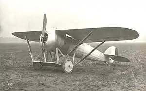 The tapered shoulder mounted wing was supported by lift struts attached to the landing gear, which featured an additional constant chord lifting area between the wheels. A section of wing root was cut away to improve downward visibility.[1] The fuselage and wing were fabric covered. It was armed with two synchronized 7.7 mm (0.30 in) Vickers machine guns.[2] The first prototype made its first flight in early January 1918 while powered by a 110 kW (150 hp) Gnome Monosoupape 9N rotary engine,[1] the same engine used in the Nieuport 28.