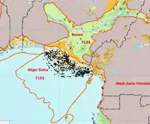 The Niger Delta Basin, also referred to as the Niger Delta province, is an extensional rift basin located in the Niger Delta and the Gulf of Guinea on the passive continental margin near the western coast of Nigeria[1] with suspected or proven access to Cameroon, Equatorial Guinea and São Tomé and Príncipe. This basin is very complex, and it carries high economic value as it contains a very productive petroleum system. The Niger delta basin is one of the largest subaerial basins in Africa. It has a subaerial area of about 75,000 km2, a total area of 300,000 km2, and a sediment fill of 500,000 km3.[1] The sediment fill has a depth between 9–12 km.[2] It is composed of several different geologic formations that indicate how this basin could have formed, as well as the regional and large scale tectonics of the area. The Niger Delta Basin is an extensional basin surrounded by many other basins in the area that all formed from similar processes. The Niger Delta Basin lies in the south westernmost part of a larger tectonic structure, the Benue Trough. The other side of the basin is bounded by the Cameroon Volcanic Line and the transform passive continental margin.[2]