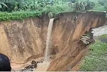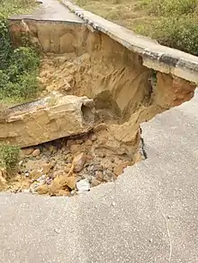 The Nigeria gully erosion crisis has been ongoing since before 1980, and affects communities large and small. It is an ecological, environmental, economic, and humanitarian disaster resulting in land degradation, loss of lives, and properties worth millions of dollars. The estimated number of gullies in the country is at 3,000. They occur due to sandy soil being unable to withstand the runoff and eventually eroding away, leaving gaping gullies that swallow homes and other infrastructure. Gullies and areas exposed to erosion in Southeastern Nigeria tripled from about 1.33% (1,021 km2) in 1976 to about 3.7% (2,820 km2) in 2006 making the region the most affected region in the country.[1]