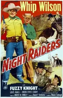 Night Raiders is a 1952 American western film directed by Howard Bretherton with a screenplay by Maurice Tombragel.[1] [2] The film was written as a star vehicle for Whip Wilson, who portrayed himself in the film. The plot of the film involves Whip saving a town from a corrupt Sheriff and his goons. The film also stars Fuzzy Knight as Tex, Lois Hall as Laura Davis, Tommy Farrell as Jim Dugan, Terry Frost as Mike Lorch, Lane Bradford as Henchman Talbot, and Marshall Reed as Sheriff Ernie Hodkins. The film's sets were designed by the art director Martin Obzina.