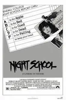 Night School (also known as Terror Eyes in the United Kingdom)[4] is a 1981 American slasher film directed by Ken Hughes and starring Rachel Ward, in her film debut, Leonard Mann, and Drew Snyder. The plot revolves around a series of brutal murders in Boston, Massachusetts.[5] Alfred Sole was the film's original director, but he passed on the project. Hughes was ultimately brought in to direct, and Night School was his final film.[6]