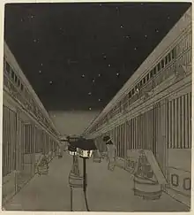 Suzuki Harunobu made many night paintings, including Two Girls on the Veranda Looking at the Moon.[22] Many of the settings were warm relational studies, such as Night Rain at the Double-Shelf Stand which includes a parlor scene with two young women and a boy. A soft mood is set with the presence of a tea set and portable hearth for boiling water. The Metropolitan Museum of Art states that this painting is a nod to Night Rains of 8 Views of the Xiao and Xiang Rivers, a painting well respected by both the Japanese and Chinese.[20]
