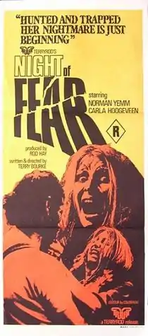 Night of Fear is a 1972 Australian horror film, directed by Terry Bourke. It was written by Bourke and produced by Rod Hay. Its theme and style bears a resemblance to the horror classic The Texas Chain Saw Massacre, released two years later. The film is notable for having no dialogue or character names. It has been called "the first Australian horror movie of the renaissance".[1]