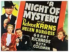 Night of Mystery is a 1937 American mystery film directed by E.A. Dupont and starring Grant Richards, Roscoe Karns and Helen Burgess. The film was a remake of The Greene Murder Case (1929), adapted from a 1928 novel of the same name.[1] Because of this it is sometimes known by the alternative title The Greene Murder Case.